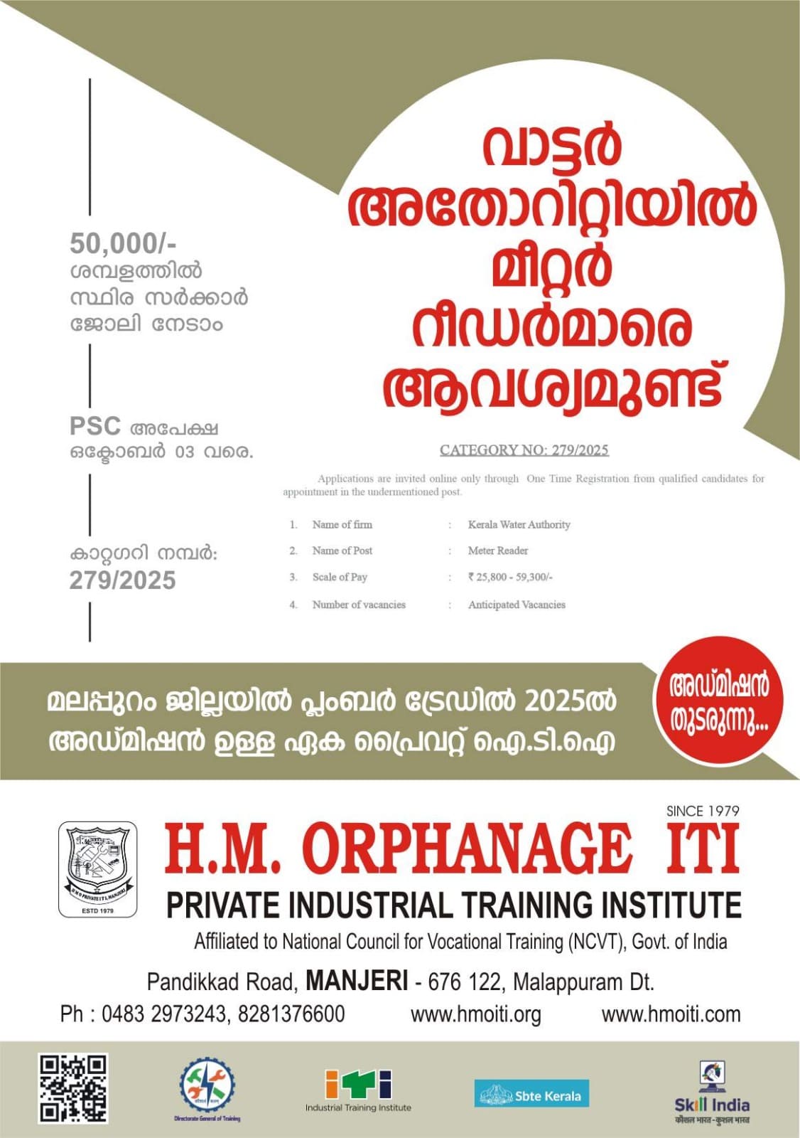 വാട്ടര് അതോറിറ്റിയില് മീറ്റര് റീഡര്മാരെ ആവശ്യമുണ്ട് 50,000/- ശമ്പളത്തിൽ സ്ഥിര സര്ക്കാര് ജോലി നേടാം; PSC അപേക്ഷ 2025 ഒക്ടോബര് 03 വരെ. കാറ്റഗറി നമ്പർ: 279/2025 *മലപ്പുറം ജില്ലയിൽ പ്ലംബർ ട്രേഡിൽ 2025ൽ അഡ്മിഷൻ ഉള്ള ഏക പ്രൈവറ്റ് ഐ.ടി.ഐ* Admission Closing Soon click↓PSC Notification Category No.279/2025